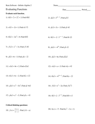 Evaluating Functions - Kuta Software Worksheet by Kuta Software LLC. Kuta Software - Infinite Algebra 2 ... Evaluating Functions. Evaluate each function. 1) h(t) = t + 2 + 3; Find h(6).